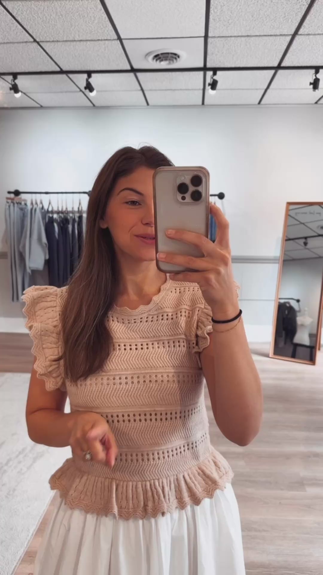 Ruffle detail sweater knit bodice and poplin woven mix skirt dress.