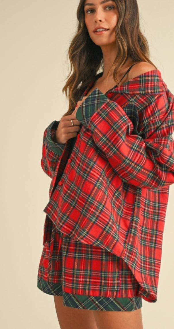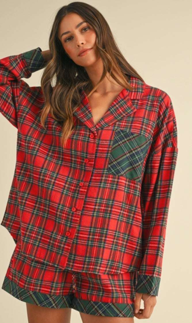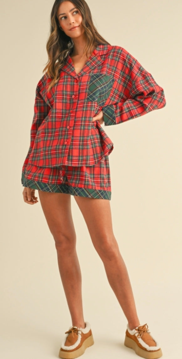 PLAID WOVEN PAJAMA SHIRT&SHORTS SET - PLAID WOVEN FABRIC - CONTRAST CUFF & POCKET DETAIL - BUTTON DOWN - LOOSE FIT